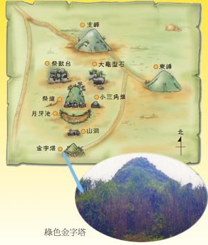 七星山頂綠色金字塔 尋訪神秘古文明遺跡 吳清祥 七星山地圖(攝影/吳清祥) 台北近郊的陽明山國家公園景觀豐富,除了森林步道、溫泉、火山地形之外,還有值得觀賞的植物群,是一個大眾化的休閒旅遊景點。凱達格蘭族後裔最近聽說公園內的七星山上有金字塔遺跡,覺得不可思議,更沒想到竟然有機會得以上山,親自目睹這尚未定論的古文明。出發前,我們約略讀了一些資料。在陽明山國家公園管理處呂理昌課長的安排下,有幸見到凱達格蘭族文化遺址重整委員會主委林勝義先生。林先生是凱達格蘭族的後裔,曾在陽明山教師研習中心向呂課長提起,七星山上應該有他祖先的一些遺址。不過,呂課長在幾次田野調查中,並沒找到。後來在林先生陪同下,辛苦地穿梭於七星山濃密的箭竹林裡,隱約感覺一股神秘的氣氛籠罩著。林先生彷彿感應到什麼似的,直說:應該在附近。終於,他們找到了綠色金字塔及其他遺跡。根據林先生的說法,七星山遺址和凱達格蘭族有關。那麼,總統府前的介壽路改名為凱達格蘭大道,又是源自什麼樣的歷史根據?原來,當時居住在北台灣的凱達格蘭族是平埔族中人數最多、發展最早、文明最盛的,而現在的總統府附近一帶,是當時凱達格蘭族練兵的地方。金字塔與祭壇在呂課長帶領下,從小油坑旁的步道開始往上爬,山路十分陡峭,四周喧囂的蟬鳴相伴。途中回首眺望,景色一片遼闊,蜿蜒的淡水河和基隆河靜靜的徜徉其間,既美麗又溫柔。走在乾枯的箭竹林裡,濃密的樹林望不到底。當我發現正前方矗立一座小山丘時,呂課長已經站在山頂上,沒想到這就是金字塔的頂端。這座金字塔是由許多巨大的岩石堆成的三角錐,高約20公尺,若不是抓著樹幹著力,還不容易攀爬上去呢。金字塔看似人工堆疊而成,從石頭縫隙看去裡面是空的。往七星山主峰的方向遙看,不遠處有一座祭壇。三個未雕刻的石碑堆砌成三角形,中間的石碑較大,兩邊稍小,呈對稱狀。石碑前有一個小廣場,在上面跳躍,會感覺地面上下震動,聲音異於一般的地面,好像踩在中空的土殼上。離石碑約6公尺,有一個月牙形凹地,有蓄水功能,它的內側朝向石碑。這片廣場,看似以石碑為中心而設置的,推測是古人祭天的場所,被稱為陵寢或祭天壇。繞到祭壇後方,有兩堆形狀特別的巨石。右邊的巨石像隻大烏龜,龜背部分還有栩栩如生的刻紋。在頭部的龜眼則朝向東北方,這與金字塔及祭壇皆指向東北方向雷同,是巧合嗎?還是有什麼奧秘存在?另一側的巨石看起來像人面石,上面刻有眼睛、鼻子,頭上看似戴了一頂帽子。此外,不遠處另有一堆巨石,最上面兩個大石頭相互依靠,形成一個天然的拱門,呂課長說這是一個祭獸台。在一萬年前,七星山頂的金字塔,正好指向當時的北極星。當時,由於冰河期結束,台北盆地一片汪洋。那個座落在凱達格蘭族聖山的祭壇,推測是巫師舉行儀式或祭祖的地方。凱達格蘭文化遺址呂課長說,能夠證明凱達格蘭族和七星山金字塔遺址相關的有力證據,是七星山南峰附近山頂上的圖騰石刻「雷公子」。根據凱達格蘭族的傳說及其他遺跡顯示,頭上戴著五條天線般船形帽的「雷公子」是凱達格蘭族的圖騰。許多證據顯示女巫居住的房子,都刻有雷公子的裝飾圖騰。目前台灣大學歷史博物館還保有這個圖騰。在七星山頂久經歲月沖刷的「雷公子」圖騰石刻,雖然有些模糊,但仍可看出和凱達格蘭族的圖騰標誌有頗多相似之處。下山後,心中仍流連於神秘巨石遺址的種種。在遙遠的過去,這塊土地極可能曾經是凱達格蘭族活動頻繁之處。但是對這裡幾處可觀的遺址,相關單位卻尚未著手研究,經歷時光的摧折,不知現場的完整性還能保持多久?蓬萊仙島在何方台灣有著非常豐富的先民遺跡,光是史前文化遺址就有1,500處左右,重要遺址也有一百多處。根據《山海經》記載:蓬萊山在東海中,島上諸仙人及不死之藥皆在,其物禽獸盡白,宮闕以黃金銀做成。古籍所載東海蓬萊山是不是指台灣呢?呂課長說,台灣除了是一個美麗的島嶼之外,也是全球物種最多之處,數目幾乎和整個歐洲大陸相當。約400年前,由於台灣氣候溫和,物產豐富,就像個蓬萊仙島,因此住在福民來台,追求較好的生活。清朝規定移民到台灣的男丁不得攜帶女眷。當時的平埔族是母系社會,這些單身漢移民入贅,和原住民通婚。有句話說:「有唐山公,無唐山媽」,當時移民的後代,也就是一部分現在所謂的台灣人,他們可能保有平埔族血統而不自知哩!到七星山雖然是短短的一天,但對我而言,心理卻是五味雜陳。除了上山的苦和下山的輕鬆成對比之外,親眼目睹先民的神秘遺跡,叫人難忘。此外,經由林先生及呂課長多年研究後的解說,更開啟了我對台灣人文的一點認識,也覺查到自己對台灣先民的瞭解與關心太少。我想,今天就算是一個起步。