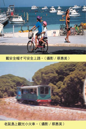 老鼠島上騎腳踏車 有袋老鼠與旅人的天堂樂土 蔡惠美 很多人去過西澳柏斯(Perth),但提到老鼠島(Rottnest Island),就不太有人知道了。柏斯靠近印度洋,位於天鵝河上(Swan River),距海口約有20公里。而天鵝河口和印度洋交會地方是海港弗雷曼托(Fremantle)。兩個城市的關係,就像台北和淡水一樣,老鼠島就在弗港外海約19公里處。渡海到柏斯外島先租腳踏車我計劃花一天時間遊弗港,當日來回,另一天的時間則安排遊老鼠島。在去弗港的火車上,遇見一對年輕人,背著背包,還牽著腳踏車一起上火車。和他們聊起來,才知道他們來自法國,腳踏車是在柏斯租的,準備先帶到弗雷曼托,再從那裡坐渡輪前往老鼠島。有腳踏車,可以在島上遊山玩水。這也正是本人的如意算盤,只是我會由柏斯的河港上船,可以順便看看天鵝河上風光。隔天上午一大早,我就在柏斯的港口等渡輪。渡輪口附近,果然有一些人訂腳踏車,先付錢拿訂單,到了老鼠島再憑單取車。收錢的先生說,到島上再租腳踏車,也是個辦法,不過,他不保證一定有車就是了。我心想,此時旅遊旺季剛過,再加上渡輪就要啟航,決定先上船再說。船分豪華、經濟兩種,差別是10元澳幣和一杯熱茶。我坐在樓下經濟艙,沿途天鵝河兩岸,風景絕佳,可惜一隻黑天鵝的身影也沒看到。約1小時20分後抵達弗雷曼托。出了弗港,馬上有風又有浪,海水不時打進渡輪的甲板。印度洋發威,直叫人沒辦法抗拒。巔了半個小時,老鼠島到了。不少人還真從船艙裡牽出他們自己帶來的腳踏車,有粉紅,有鮮綠,式樣也不一樣,光是欣賞這些漂亮的腳踏車,就很有看頭了。何況,有些小孩個頭小,步履不穩,推著腳踏車的樣子,更是笨拙吃力得可愛。戴上安全帽騎車上路還沒走出港口,一個大大的告示牌就擋在路當中,上面是「騎腳踏車必須戴安全帽」,下面用圖畫和數學等式表示:「腳踏車+安全帽=安全上路」,大概是給不識字的小朋友看的。果然人群當中小頭鑽來鑽去,小安全帽五顏六色。離開堤岸所在地湯姆森灣(Tomson Bay),向老鼠島旅社(Rottnest Hotel)方向,往左邊走約百多公尺,可以看到島上唯一租腳踏車地方。「要幾吋的?要不要變速的?」租金一天澳幣15元,約合台幣300元,還要保證金。我拿到一部最陽春的腳踏車,戴上千篇一律的深藍色安全帽。驕陽之下,在島上四處穿梭,公路上沒有什麼住家商店,就像是在沙漠中騎駱駝。小背包裡的水,一下子就喝掉了一大半。這回是上坡的馬路,我雖然努力踩著踏板,但車子愈走愈慢,最後不得不牽著車走一段路,好不容易才到稍微平坦的瞭望台。正好一面觀賞腳底下遠處的海岸風景,一面喝水喘口氣。到了平交道,剛好觀光小火車通過,火車及腳踏車上的乘客互相揮手,我們羨慕他們的氣定神閒,他們羨慕我們的自由自在。倒不後悔沒有參加此地的遊覽行程,在二小時內,安排參觀此地原有的監牢、小教堂,再乘遊覽車瀏覽全島,涼快舒適有之,卻可能沒有我騎腳踏車想停就停、想走就走的樂趣吧!大灰鼠是有袋動物才在嘀咕怎麼還沒看到此地特別有名的大老鼠,正好來到一個路旁樹蔭下的木造亭,亭裡的大看板,畫了三隻奇特的灰鼠,看老鼠的地方終於到了。亭裡陳列了一些圖片及說明,介紹島上最吸引觀光客的動物,有袋老鼠(Quokka)。有袋?不就是袋鼠嗎?這種大老鼠是澳洲袋鼠的親戚,但體型小得多,大約像貓一般大。當初(1969年)荷蘭探險家Vlamingh看到島上到處是這種大型老鼠,就把這個島叫做老鼠窩(Rottnest)了。就在木造亭外樹蔭下,我看到了幾隻有袋鼠。它們前腳極短,後腳很長,卻不太愛跑跳,斯文得像兔子。我用相機近距離對準它,也不會馬上跑開。可惜有袋老鼠灰頭土臉,又喜歡躲在蔭涼的樹下,拍起照來,一點也不上相,保護色太強烈了。書上說此島的大老鼠居民有8000到12000隻之多,遊客應該是常常可以遇到的。回到堤岸,還了腳踏車,再買些食物與飲料充饑解渴。此地垃圾嚴格分類,而且,最後一班回柏斯的渡輪會把島上所有的垃圾帶回大陸去處理,用意是要讓這裡成為乾淨的觀光地,不讓垃圾引來其他的動物,讓有袋老鼠在沒有天敵的情況下,舒舒服服過日子。許多遊客在沙灘上玩耍,有人去潛水,看珊瑚或看沉船殘骸,有人乘玻璃船出港。我則在離Rottnest Lodge(以前是監獄牢房,現在是平民旅社)不遠的一大片草地上,聽著風聲,看著小朋友騎腳踏車繞圈子。回程的渡輪在招呼,堤岸碼頭上一下子聚集了好多人。這是最後一班渡輪了,如果還有下一班,我願多停留一段時間。