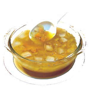 什錦水果甜湯 白宜芳 攝影/馨雨 台灣盛產水果,種類豐富價格實惠,尤其炎夏六月至八、九月,芒果、荔枝、龍眼陸續上市,在盛產時期常低價求售,買多了又吃不完,除了切盤、打汁之外,只有少數人能把水果變成水果乾、水果派、水果糕餅、水果冰淇淋等,因為這牽涉到技術、經驗及設備。一般家庭要改變水果吃的方式,延長並增加水果的食用價值,最簡單就是將水果煮成「湯」來享用,自用或宴客兩相宜喔!費用:100元~300元不等,需視水果種類與價格而定,其中10元~30元費用是糖水或調味的桂花、檸檬等。材料:以當令盛產水果1~2樣為主,再組合市面上其他水果3~6樣即可,建議不要買太貴的水果煮湯,那將會被朋友或家人說:焚琴煮鶴!耗時:30分鐘~50分鐘,如果像龍眼、荔枝或葡萄,有皮有籽要剝弄,量多時需找人幫忙;水果湯主要靠刀工的靈巧與剝皮弄籽的技術。過程:(一) 先將水果外皮洗淨,同時燒一鍋水,水的量能將水果淹滿即可;在煮水的同時,陸續將水果切成小丁狀,注意不要讓水果水分大量流失。不可以把水果先切了,再等著煮湯,要邊切邊煮,最好把水果放在盤子上切,水分完全保留起來,切好一種水果,果肉連同果汁放到大碗公內準備候煮。(二) 水開了即刻下煮,較耐煮的水果先放,如:楊桃、水梨、蘋果…等;不耐煮的水果後放,如:櫻桃、芒果、葡萄…等。依序投入水果烹煮時,火候不要大,整鍋湯開始起泡微沸時,輕微攪拌,加入冰糖後熄火。(三) 煮好的水果湯要等到冷卻後,才能調入檸檬汁或桂花水等,整鍋拿到冰箱冷藏,可保存五天食用。糖水:單純水果湯煮好是微酸不甜的,口感上需加入檸檬、冰糖來增色,通常煮一小鍋用一顆檸檬、一大鍋用兩顆;水果湯不宜太酸,用蜂蜜、果糖糖漿是最棒的,其次是冰糖、白砂糖,最好不要用赤砂糖、黑糖,因為味道不對。調味:水果湯適合加入共食的有:杏仁豆腐、愛玉、白木耳、白粉圓、葡萄乾...等,但要注意切的形狀大小得適中;像白木耳需蒸熟後切丁共煮,葡萄乾要先用極燙的開水浸泡柔軟後備用。茉莉花、桂花經沖泡濾取濃汁加入水果湯可增加風味。