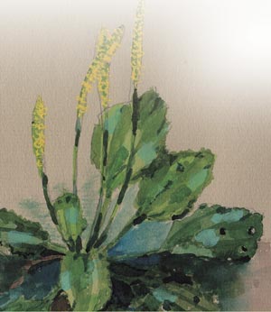 車前草-- 五根草 子嫣 圖/子焉 車前草圓圓的葉子混雜在公園的草堆中,照理說應該是很容易辨識出來的。但它的葉子幾乎是貼著地面從中心放射而出,所以要到找它們,還得放低身段彎著腰慢慢地找。六月時由葉間抽出花莖,呈花穗狀,隨後會開出白色細細小小的花。約在秋天結成黑褐色的果子,等成熟了種子會隨風飛散。散落的種子經由朝露的滋潤,在吸滿水份後會生出黏性極強的糊狀物。再來就等著看誰走過那裡,種子就緊緊的黏著他的襪子、褲子,跟隨著他散佈到離母株遙遠、更遙遠的各個角落去。功效:藥用部份:種子用 途:1.利尿2.消腫—生葉用火烘焙後 3.消除蚊蟲咬紅腫—生葉直接塗在患部