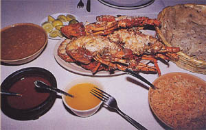 美墨邊城 大啖龍蝦 蔡惠美 龍蝦大餐配玉米餠 輕輕鬆鬆就越了界友依瑪是墨西哥裔美國人,住在洛杉磯,這次他們全家帶著我,開車往南,經聖地牙哥,越過美墨邊界,向蒂娃納(Tijuana)、羅沙利多(Rosarito)以及恩聖拿達(Ensenada)一帶旅遊。我久聞這一帶的海鮮有名,尤其嚮往羅沙利多海岸地區的龍蝦大餐,現在終於付諸行動了。一大早由洛城出發,只知道由聖地牙哥到美國與墨西哥邊界San Ysidro Border,約有二十多公里路程。果然,車子離開聖地牙哥不到三十分鐘,我們就已經停在邊界上。大清早車子少,查關人員的效率也高明,車子更在五分鐘之內,就由邊界到達蒂娃納市中心。 蒂娃納,是攤販天堂車子停妥,眾人一下子陷入滿街的小攤販陣,很難向前移行。蒂娃納很像國內的夜市或批發街熱鬧滾滾時的情況,到處可以看到墨西哥婦女在地攤上擺售小玩藝,有項鍊、玩偶、小陶器等。價位不高,當然貨也不見細緻,卻是五顏六色,吸引路人駐足。有購物天堂之稱的蒂娃納,大街兩旁,盡是各類商品,墨西哥式披肩及草帽,更是此地特產。有一些皮包店,只賣仿冒法國名牌路易威登的商品,竟然有整屋子的樣式供人挑選,簡直是路易威登產品的大展示場,比起正牌店只擺少數幾件精品,更讓人大開眼界。一般商店店員是清一色墨西哥男士,不像地攤貨全由婦女坐鎮,倒也是有趣現象。蒂娃納的小吃攤特別多,依瑪帶著大家吃了一頓豐盛的道地墨西哥餐,有玉米餅、煮紅豆,酪梨醬配碎肉餅,價廉又物美。她允諾大家,下一頓大餐,保證是龍蝦一大盤,不過要到蒂娃納南部,開車約一小時的龍蝦村(Lobster village)去吃。進得寶山,伺機下手離開蒂娃納市,在墨西哥境內下加州地區(Baja California)沿海岸的墨國一號公路上飛奔向南,是一種愉快的經驗。因為這條公路就在太平洋岸,是標準的觀景公路(scenic route),景色迷人,自然不在話下。而公路旁不時出現的大紅龍蝦招牌,最令我興奮。龍蝦村所在地新港(Puerto Nuevo),在蒂娃納與恩聖拿達港的途中,在新港小鎮,街上行人不多,藝品店也只有幾家,海灘上弄潮的玩水客,更顯得懶洋洋。我走在有些坡度的大街上,只看到兩旁高高低低懸掛的招牌,上面不是寫著英文字lobster,就是畫著紅咚咚的大龍蝦。來到龍蝦村,根本不愁找不到地方大吃一頓,只是要選那一家下手,著實需要一番考量。有的龍蝦店門口,站了一堆人,原來裡面早已坐滿了老饕客。站在門外的食客,需要耐心和忠心,有人等了一小時,才有機會入門。不等我們東張西望,在大街上舉棋不定,龍蝦店的街頭推銷員早已注意到我們,開始由四面八方靠近。東拉西扯,最後看緣份原先在大街上和人聊天的中年婦女,首先發難。她一邊揚著手中的小看板廣告對我招手,一邊小跑步過街來到大家面前。小紙板上寫著:龍蝦大餐每位美金8.99元,附送麵包、啤酒和沙拉。嗯,不貴嘛!說時遲,那時快,我的身旁不知何時又鑽出一位年輕戴眼鏡的墨西哥女子。她身上背著一個大黑紙框,上面貼著龍蝦餐照片,手上還握著一個粉紅色紙板,剪成大龍蝦形狀。這下大家看得更清楚明白了;龍蝦餐包括大龍蝦,墨西哥辣椒醬汁,煮紅豆,玉米餅,炒飯,熱湯,沙拉,以及飲料等,大大小小盤子就超過十個!好不容易擺脫了這兩位熱心的推銷員,我們才發現這一條大街上,龍蝦餐館至少也有十多家,難怪競爭激烈,拉生意拉到街口。有些店面,用巨大的招牌畫隻大龍蝦吸引顧客;有些餐廳有花園,大遮陽傘,甚至有大氣球。空氣裡,則瀰漫著烤肉香和酒香,偶爾還傳來陣陣的歌聲……。來到一家店門口,這次遇到的推銷員是穿著白上衣黑長褲,戴著紅領帶的侍者。他嘰哩咕嚕的指著手上的紙板廣告,還把剛從門內走出來的走唱歌手(Mariachi)拉過來助陣,兩人一搭一檔的唱和著。紙板上,龍蝦餐的價格是美金八元,看來是最低價,最高價在附近的另一家,12.99元。大概終於走累了,看厭了,也開始肚子餓了,我們最後下定決心,選了一家餐廳進入。這家與我們有緣的龍蝦店,當然也是高朋滿座,一桌又一桌的客人,興高采烈的吃著、喝著。桌上的龍蝦殼,這裡一堆,那裡一堆,正是眾人大吃後的產物。而圍著桌子賣力演出的走唱樂隊,歌聲卻是模模糊糊的。龍蝦是進口,怪!我拿著相機,溜到廚房裡參觀。看到一隻隻龍蝦在大油鍋裡炸成大紅色,真過癮。廚房裡的墨西哥婦女,還很熱情的歡迎我見識她們做玉米餅(tortilla)絕招;玉米磨成粉,加水揉成麵糰,可以用小麵棍,桿成圓片,也可以把小麵糰夾在兩片圓形的木板之間,用手拍成薄片。做成的小圓餅,顏色泛黃,在火爐上烤一下,就可以上桌了。回到座位,我順手拿起宣傳單瀏覽,才知道新港龍蝦村有一百家餐廳,每年吸引上萬的美國人來此地消費。這種大餐,人稱新港式龍蝦,不過,最有意思的卻是,此地龍蝦都是由外國進口的。