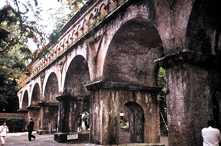 羅馬式水道橋 蔡惠美 日本古都京都市內也有古羅馬式水道橋,夠奇怪吧!隨著帝國勢力的伸張,古羅馬人所建的水道橋,如今在南歐甚至北非一帶都看得到。水道橋是引水道,可以由遠處引入水流,供灌溉或其他用途。日本並沒有古羅馬時代建築。明治年間,因為想把位於京都東北側大湖—琵琶湖的湖水引入城內,供應水力發電等工業用途,就在南禪寺境內建築疏水道明渠。當設計師提出模仿古羅馬式水道橋的構圖時,曾經受到朝野多人反對,理由是南禪寺與古羅馬毫無關係,怕破壞了景觀。南禪寺是龜山天皇的離宮擴建而成,為日本佛教禪宗的總本山。重要的建築包括三門、大方丈以及南禪院,南禪院即原來的離宮舊址。進入位於洛東的南禪寺三門,經中央大道由法堂向南再往南禪院走去,介於大方丈與南禪院之間的水道橋就橫擋在眼前。高五公尺餘,日語稱為「水路閣」的水道橋像大橋一般外貌,卻是疏水道,做成由西向東傾斜,使水由橋頂的最高層流過。為紀念琵琶湖疏水一百年而建的「琵琶湖疏水紀念館」(1989年),館外是個大蓄水池,水路閣的水來自琵琶湖,即與此大蓄水池相通。京都通往琵琶湖的古道,現在是京都的地下鐵東西線。南禪寺附近即為東西線的大站「蹴上」。