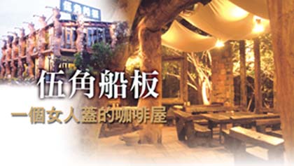 伍角船板 一個女人蓋的咖啡屋 林谷均 一天我在海灘撿木頭,沙灘上擱淺著一塊船板,船板上有一枚伍角舊幣。當時我想如果能建一個有風格的屋子,那名字就是「伍角船板」……一次行經台南後壁時,驚見路旁有一奇特建築,名為「伍角船板」,有一點好奇,卻又因故無法一探究竟。半年後,再經過時發現它已被夷為平地,心裡有些惆悵,什麼是伍角船板呢?想不到最近又在高速公路見到一個看板「伍角船板 一個女人蓋的房子」,這下可不能再錯過了……天馬行空怪建築位於新營金華路的伍角船板,遠遠望去像個「大而無當」的搞怪建築。可是當來到由古早的大門板做成的大門時,不禁讓我這五年級生倍感親切。一進門高挑的空間,超大型落地窗,聳立的早期電線杆,以廢枕木拼湊成超長超寬的桌椅,讓我憶起兒時點點滴滴。最特殊的則是屋內一棵與室外龍眼樹林相輝映的大樹,搭配屋外小池塘,讓人彷彿置身在熱帶雨林中野餐。獨家燒製的陶藝餐具也是一個特色,樸拙而笨重,不會有一般咖啡屋給人拘謹的束縛感,完全是家居用餐時「粗茶淡飯」的Feeling,至於浪漫氣氛就靠自己去培養了。伍角船板的裝潢雖不是純然的古色古香,可是卻蘊含原味與創新所造成的另類視覺饗宴。小女子起厝築夢八歲時就在樹上築窩的老闆謝麗香,從小就夢想有朝一日能自己「起厝」。後壁鄉的伍角船板是她實踐夢想的第一棟房子,可惜沒多久就因是違建而拆除,多年的積蓄與夢想毀於一旦。可是伍角船板小女子起大厝的故事逐漸傳開,在好友陳緯一大力支持下,謝小姐一口氣又在新營、嘉義、台南開了三家,完全出自謝麗香IDEA的伍角船板,「奇形怪狀」依舊是其最大風格與特色……難怪小地方咖啡屋躍居全國性知名搞怪建築。謝麗香表示:「一磚一瓦一枕一木,並沒有事先構圖……,是在一種隨心所至的感覺下完成。自然的東西運用在得體的地方,那是一種巧合,也是一種趣味。」歷經錯失與惆悵,我的造訪不也是一種巧合!無論您是否具有搞怪因子,但願您也有這樣的機緣,一睹伍角船板的特殊風格。伍角船板(新營):06-659-2182