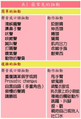 抽動為突然、快速、無目的、重複、無節律、刻板的動作與發聲。抽動可能持續不超過一年的短暫出現,也可能是持續超過一年的慢性疾病;可能是自發性的,也可能是間接引起的。抽動可分為簡單型及複雜型兩種。表1列舉一些常見的抽動症狀。