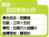 我喜歡技藝專班,它讓我有學習技能的機會,更讓我知道我現在學會的技能是以後工作的初步基礎,這是一個能夠讓我快樂成長、進步的班級。◇