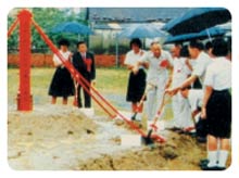 李校長於民國72年6月18日為綜合大樓興建冒雨破土。