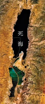 圖中A及B分別代表考古學家猜測之所多瑪及蛾摩拉的位置。(NASA)
