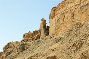 以色列所多瑪山,據說中間獨立岩柱是聖經中記載羅得妻子變成的鹽柱。(維基百科)