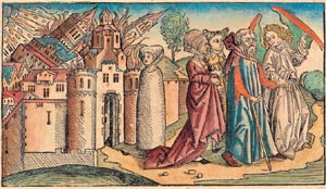 紐倫堡編年史中的所多瑪與蛾摩拉事件,Hartmann Schedel, 1493年。羅得的妻子(圖中)已經變成鹽柱。(維基百科)