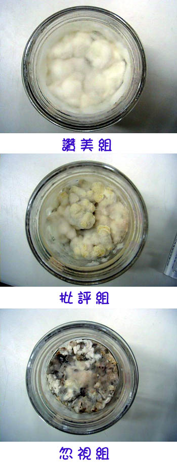 校園善念實驗特輯(三) 似酒?發酸?全在一念之間! 孫麗珠 當了二十多年的級任導師,經常在親師通訊上寫上「孩子永遠朝讚美的方向發展」、「在批評中長大的孩子學會抱怨,而在讚美中長大的孩子則充滿自信」……等文字與家長互相勉勵。但一踏進教育現場,這些理想或高調似乎就消失得無影無蹤了。孩子的純真、善良常變得微不足道,衝口而出的往往是自己最不願意聽到的負面言詞,然而在「愛之深,責之切」、「老師是為你們好」這保護傘下,我依舊批判著學生,要求他們至少要達到我設定的最低標準。但結果也一直不如我預期。 當知道大紀元時報徵求做善念實驗時,我很想試試,因為人愛聽好話、喜歡被稱讚,這容易理解,可是水、米飯這些,對我而言應該是無生命的東西,怎麼可能聽懂呢?於是和任教自然領域的同事張玉華老師商討,並請教如何才合乎科學精神,沒想到張老師興致很高,並且決定一起共襄盛舉!而實驗結果真的與日本江本勝博士的研究相同,米飯它果然能「感受」到我的心聲!當我對它發出善意、真誠的讚美時,它的菌絲分佈是多麼的祥和、美好呀!就像一朵朵潔白的雲;而被我棄之一旁的可憐忽視組,下場卻是比批評組更加醜陋、不堪。當我重新審視實驗記錄時,發現這三瓶對照組在前五、六天的實驗結果很相似,根本沒有很大的差異;但到第十二天時三瓶就有了很明顯的差異,接下來幾天的結果就更是迥然不同了。我也體會到小學一年級的孩子們就像那三瓶米飯一樣,在前五、六天內,不管我的批評或讚美,雖然孩子內心裡已有不同反應,但表面上卻不敢表現出來。而當孩子長大後,他在兒童時期所接收到的老師意念,已逐漸地在他人生發酵了;究竟是香醇似酒、令人回味無窮,抑或是刻薄似醋、令人發酸反胃呢?在這不同的境遇中,我這位教師,在孩子們的童年期,確實起到了關鍵性的影響呀!頓時我才恍然大悟:為何明明知道善念對孩子們是如此重要,卻一再用批判的態度來對待這群純真的孩子!原來我仍根深蒂固地緊抱著「棒下出孝子」、「不打不成器」這種立竿見影式的教導。因為孩子們如果都安安靜靜的在我掌控中進行學習,那是一件多麼輕鬆且「有效率」的教育方式呀!但我並未深入探究我的一言一行、甚至意念對他們心靈所造成的影響……,這也是我長期教學的盲點。雖然每一屆學生我只擔任二年的班導師,但我相信我對他們的影響在某一部份卻是一輩子的,這個影響目前可能看不到,但並不表示不存在,身為教師的我不可不慎呀!張玉華老師感謝有這樣的機會做此實驗,深切體會到人應該時時保持正向的意念,對別人和自己常說正向鼓勵的話語,這樣對人、對己都有莫大的助益哦!學生感想郭奐均:媽媽咪呀!那瓶我們又沒罵他的米飯怎麼變得那麼醜,好可怕唷!郭沛妤:做完實驗,感到不可思議,怎麼會這樣呢?這是我從來沒有想過的。想想我平常心情不好時,不知偷偷罵了多少的話,那我不就和那瓶米飯一樣變得又醜又可怕了嗎!老師說:「對呀!所以我們平常要說話前一定要先想一想啊!」我以後一定要提醒自己,我才不要變成人見人怕的醜八怪呢,我一定要「心存善念,口說好話。」實驗簡介 時間:92年1月17日至2月20日,共35天學校:高雄市瑞豐國小老師:孫麗珠、張玉華學生:郭沛妤、郭奐均材料:米飯3份(重量相同)、廣口瓶3個實驗方法1.將米飯分別放進瓶子裡,瓶子加蓋。2.早晚分別對讚美組、批評組和忽視組發出不同的意念。‧讚美組:「你很棒」、 「謝謝你」。‧批評組:「你真差勁」、「你是個大笨蛋」。‧忽視組:不發出任何意念。實驗結果2月20日:(第35天)讚美組的雪白菌絲仍呈花朵形狀,且聞到一股發酵過的釀酒味道,香醇而不發酸哦!另兩組對照瓶雖有發酵味道,但還是有所不同,請參照圖片可清楚辨識其中的差異。※小插曲:第26天時觀察讚美組,其表面除了雪白的菌絲覆蓋之外,彷彿呈現一個「米」字型的圖案,樣子很像中間有一朵白雲而圍繞在其四周有八朵小白雲喔,可惜當時沒法馬上拍照。