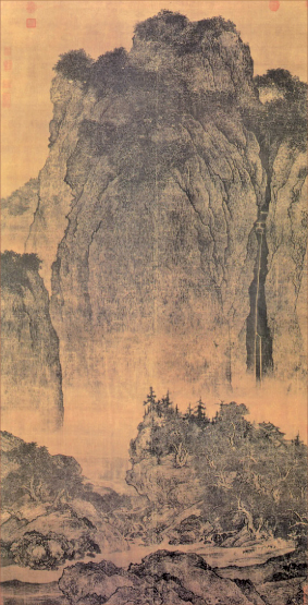 范寬,名中正,字中立,陝西華原(今耀縣)人;北宋畫家,擅長山水畫。北宋劉道醇《聖朝名畫評》說到范寬:「性溫厚,有大度,故時人目為范寬。居山林間,常危坐終日,縱目四顧,以求其妙。」郭若虛《圖畫見聞志》說他:「進止疏野,性嗜酒好道。」看來是位個性落拓的求道者;《宣和畫譜》描述了他學畫悟道的經過:「初學李成(五代山東畫家),既悟,乃歎曰:『前人之法,未嘗不近取諸物。吾與其師於人者,未若師諸物也。吾與其師於物者,未若師諸心。』於是捨其舊習,卜居終南、太華岩隈林麓之間,而覽其雲煙慘澹、風月陰霽難狀之景,默與神遇……,故天下皆稱寬善與山傳神。」