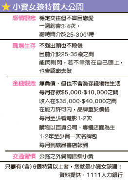 【記者陳瑋臻/台北報導】拜金女當不起、便利貼女孩太委屈,職場上「小資女孩」正流行。據人力銀行針對未婚粉領族進行的調查發現,有將近5成2的受訪者屬於小資女孩,其中又以「媒體出版業」及「資訊科技業」最多。
