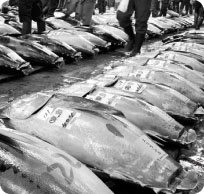 黑鮪魚瀕臨絕種,環保人士盼各界重視此問題。圖為東京一處正販賣黑鮪魚。