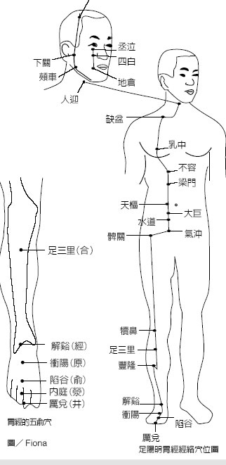 厲兌穴(位在第2腳趾頭的內側,靠近第3個趾頭)就是胃經的井穴,突然昏倒時,可用指頭掐厲兌穴;腳盤上有「內庭穴」,是胃經的滎穴;順行而上為「陷谷穴」,是胃經的俞穴;「衝陽穴」則是胃經的原穴,而治五臟、六腑的病要找原穴,所以衝陽穴非常重要;此外,在綁鞋帶之處則為「解谿穴」,是胃經的經穴;然後再到膝蓋下面三寸的地方的外側有個「足三里穴」,這是胃經的合穴。中醫講「肚腹三里求」,肚子痛、胃痛要找足三里穴,只要病症的位置有胃經通過,都可以把將之引下來,包括:頭痛、頭暈、牙齒痛,足三里是特效穴。