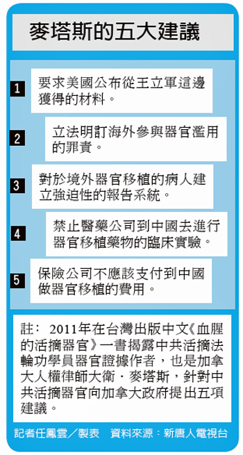 朱婉琪建議台灣政府參考加拿大人權律師大衛.麥塔斯的兩項建議「立法明訂海外參與器官濫用的罪責」以及「保險公司不應該支付到中國做器官移植的費用」。