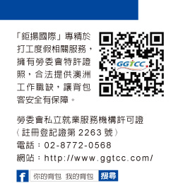 隨著澳洲打工成為熱門話題,簽證代辦與澳洲當地工作仲介,也成為一股新的商機,許多業者紛紛投入這個方興未艾的市場。在台灣的代辦業者中,鉅揚國際顧問(GGTCC)因為有著特殊的背景與理念,成為許多背包客赴澳前諮詢的首選。
