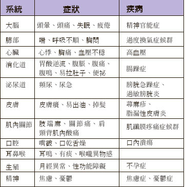 壓力大如果不適時紓壓,時間久了,就容易產生如頭痛、頭暈、胸悶、心悸、胃腸不適、呼吸不順等症狀。因為抗壓性不同,症狀因人而異。(如下表所述)。而這些症狀,最後也很可能會發展成疾病,如高血壓、心臟病、糖尿病、消化性潰瘍等。