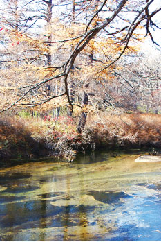秋末冬初,戰場之原的清晨,樹枝上竟然也會沁出一滴一滴的朝露,枯萎的樹幹、泛黃的枯葉上的露珠,表面看起來不搭配,但是卻透露出一種難以言喻的曖昧。戰場之原的深秋枯黃大地有分熟齡之美,一種世故帶點失落、歷練帶點風霜、一種枯寂的美。