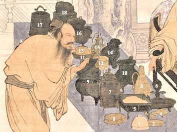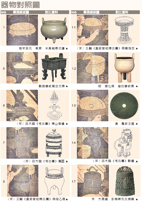 長鬚文士蹙眉審視的專注神態,及其主要的品鑑對象並非一般琴棋書畫,而是上溯三代的古青銅器,展現杜堇寓道於畫的特別設計。本次展出特別考證畫中描繪的器物類型,與故宮院藏類似的器型交相對照。◇