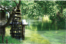 孕育這片山葵田的河流叫做「犀川」,溪流旁的樹蔭遮掩住了炎熱的陽光,山葵田邊有很多垂楊樹,讓田景格外蒼翠、濃鬱。在新綠鮮嫩的垂楊與山葵所譜出滿滿墨綠色世界,恍若置身於陽光清溪與山葵編織成的青綠筐籃之中。在農場一隅有座水車屋,利用湧出的山泉帶動水車,日本一代電影宗師黑澤明導演的作品《夢》,在電影最後一段短篇故事中,黑澤明以「水車村」暗喻桃花源,大王山葵農場的水車屋於焉入鏡,可見這座農場在大導演心中如烏托邦一般美麗脫俗。
