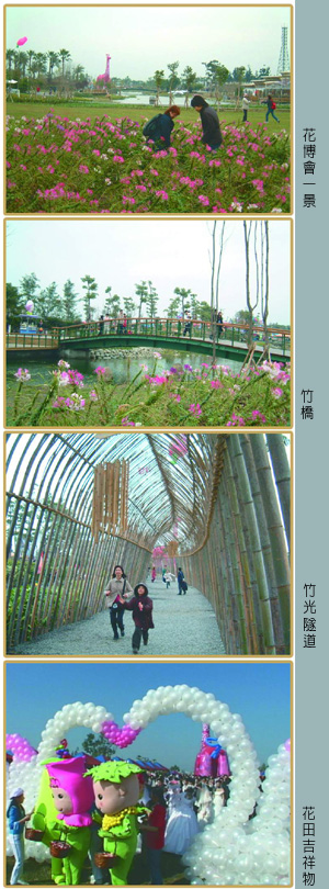 花花世界——台灣花卉博覽會(13版) 林谷均 攝影/林谷均 春節期間,最熱門發燒的新興旅遊地─台灣花卉博覽會,已吸引超過40萬賞花人潮。「輸人不輸陣」趕緊來看嘪!! 堪稱台灣歷年最盛大的花卉嘉年華——台灣花卉博覽會,十六日已在彰化溪洲亮麗登場,花團錦簇的花博會,展期至三月十四日止共五十八天。目前已吸引數十萬人參觀。您即使沒有搶得頭彩,寒假期間請勿錯過,藉由親近「花、綠、風、光、水」等自然之美,領略真實的「花花世界」。台灣新花樣彰化縣花卉種植面積達五千公頃,位居全國之冠,「田尾公路花園」大家早已耳熟能詳,也是愛花人士,經常造訪的地方。這次花卉博覽會,是由彰化縣政府與田尾、永靖等花卉業者組成經營團隊,企圖為彰化打造一個全新的花田城市。期與荷蘭、日本等國際知名花卉城市並駕齊驅。光看彰化縣府的企圖心,就值得您走一趟花博會。花博會一期園區有二十一公頃,主要以台灣原生樹種與花卉為題材,「五大庭園區」是不可錯過的重頭戲,民眾可分別體會「歐式庭園」的幽雅浪漫、「台灣庭園」的古樸懷舊、「兒童庭園」的活潑熱鬧、「熱帶庭園」的粗獷熱情以及「舒壓庭園」的輕鬆愜意。另外設有鬱金香花園、玫瑰花園及彩虹花園,各具特色的主題園,您可隨意瀏覽、也可依著生態解說牌,深入瞭解各種植物花卉。以專館靜態展出的「花卉主題館、花漾人生館、花精靈影像館」,更能表現花卉深刻之美。姥姥遊觀園除了萬紫千紅的視覺享受外,每一天野趣草坪上也都會有精彩的音樂、舞蹈等文化饗宴。適逢節日,還有大型演唱會與遊客同樂。另外,提供彰化肉圓、貓鼠麵等道地小吃的「美食街」與視野極佳的「中央餐廳」,都是您充電休息、欣賞景致的好地方。在園區走累了,伴著氣笛聲蜿蜒前進的遊園車是您最佳的代步工具,花一點小錢搭車悠遊園區,彷如置身歐洲浪漫情懷中。當然您若以「劉姥姥遊大觀園」的心情,戲看繁花,驚豔中也有欣喜。小朋友也可和可愛的花博娃娃合影,或買個吉祥物紀念品,留下珍貴回憶。充滿創意與巧思的「台灣花卉博覽會」,請您細細品味,千萬不要入寶山空手而回喔!!吉祥物與花博娃娃花博會為喚起民眾對花卉植物的喜愛與加深花博會印象,特別選擇具有特色的植物做為吉祥物予以擬人化,並以個性鮮明、造型獨特的花博娃娃吸引遊客的注目。打版歸:少見的三角盾牌形葉片以及如葡萄串般的球形漿果,像個憨厚的大個兒,為人大方心地善良。馬櫻丹:從熱帶美洲移民到台灣的「歸化植物」,四季都開著五彩繽紛的花朵,引誘著蜜蜂蝴蝶的靠近,是常見的「蜜源植物」,像個活潑奔放的女孩。咬人貓:凶悍的長綠植物,全身上下都長著自衛用的針刺毛,彷彿在警告過往的行人,我可不是好惹的!個頭最小卻超愛搗蛋。口頭禪是:「我咬你喔!」鬱金香:飽滿圓潤的花冠,亭亭玉立的造型,粉嫩的花色,吸引著全球大人與小孩的目光,是這群朋友中較具國際色彩者。花博會網址:http://www.2004flowerexpo.com/