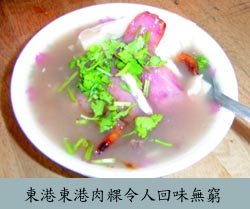 東港肉粿嚐了沒?(13版) 大武山 文/攝影 大武山肉粿 的料理配方看似簡單,用心程度不同,呈現的口感也不同。葉家肉粿,堅持用收割一年的「在來米」、自己灌製的後腿肉香腸,六十年如一日!肉粿是甚麼?你可曾吃過?聽說過?位於屏東東港鎮東隆國小斜對面,葉先生的肉粿店已有六十年的歷史,經營至今歷經三代了!肉粿店的店面雖然翻新改建,店門口的街景也不同於從前,但肉粿店的生意仍是一枝獨秀。肉粿店通常早上九點開始營業,大概到了下午三、四點就會賣完,接著又得開始準備隔天要賣的材料了。由於肉粿口味獨特、柔軟易消化、而且營養豐富、真可謂老少咸宜,因此深受鄉親喜愛,甚至還吸引許許多多外地人慕名而來呢!現在東港賣肉粿的店已不止葉先生一家了,但葉先生家的肉粿依舊是識途老馬的最愛。甚麼是肉粿?嚐嚐看!鹹粿、菜頭粿、我們可能覺得比較熟悉,至於肉粿?或許沒到過東港的人很難知道是怎麼一回事!肉粿的製作過程是:將米浸泡後加水研磨成米漿、再把米漿倒入蒸籠蒸熟,它的作法與鹹粿相同。蒸熟的粿上面再鋪上切成薄片的香腸、炒熟的三層肉、爆香的蝦米、最後淋上用虱目魚、大骨加特殊配方熬製近十個小時後以米漿勾芡的高湯。這就是一碗最道地的東港肉粿了!阿嬤的靈感深得讚賞葉先生的父親葉老先生回想六十年前,每當逢年過節時幾乎家家戶戶都會炊粿,後來漸漸地有人覺得麻煩不再自己炊粿;於是葉老先生的母親開始賣起鹹粿。過了一陣子又開始有人覺得光吃鹹粿似乎有點淡而無味,葉老先生的母親於是試著加上切片的香腸及一些爆香的配料再淋上高湯,這樣的組合不但贏得饕客的讚賞,也創造出了現在有名的「東港肉粿」! 堅持用心一甲子如一日肉粿的料理配方看似簡單,但用心程度不同,所呈現的口感也不相同。葉先生的肉粿,原料用米,堅持用收割一年的「在來米」;因為他們經過多次試驗的結果,覺得這種米所製作出的粿,Q度最好;至於配料所需的香腸;一來為了新鮮,二來為了保持品質,因此堅持自己灌製。而灌製香腸的豬肉只採用後腿肉,因為後腿肉纖維細、口感佳。許多老顧客買肉粿的同時還會要求另外買些香腸回家!六十年的歲月,考驗著經營者用心的堅持,六十年的歲月也同樣是口碑的最大保證!