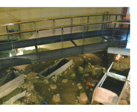 玻璃橋下的石板棺墓葬復原情境,提醒我們生活在遺址上。