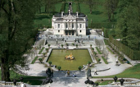 若說莎亨屋還只是別墅性質的建築,那麼路德維希二世接下來的計劃,就是如假包換的宮殿了。1874~1878年,他在一片深山密林裡興建林德霍夫宮及庭院,整棟建築採洛可可風格,其中國王寢宮的設計一如凡爾賽宮,使國王即使整天待在床上,也可以處理公事(據說這是路易十四的習慣)。