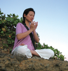 圖:趙秀華在藍夢島礁岩上打坐 |