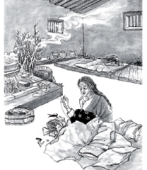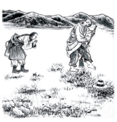 圖:密勒日巴的母親將密勒日巴求法的學費縫在行者的衣服裡 |