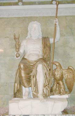 宙斯(Zeus)希臘眾神之神,是奧林匹亞的主神,宙斯神像是當時最大的室內雕像,神像所在的神殿則位於奧林匹克運動會的發源地。斐羅(Philo)撰寫記述七大奇觀時說:「我們以其他六大奇觀為榮,而敬畏宙斯神像。」