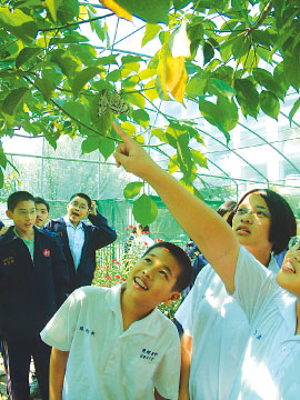 學生在該校蝴蝶園學習生態課程。