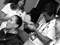 「我們也為女選手們修眉毛。不管是修眉還是剪髮,一定要剪得好,用好的染髮劑,這樣才能保證她們的頭髮在陽光下幾個小時都不會褪色。」