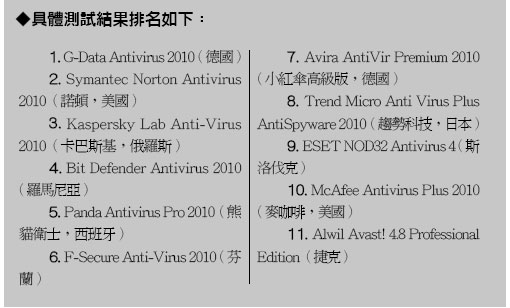 GData Antivirus 2010排名PCWorld掃毒軟體測試的首位。無論是在基於簽名的傳統測試中,還是在沒有完整簽名情況下檢測新式惡意軟體的主動防禦測試中,GData Antivirus 2010的表現都是最好的。