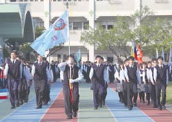 「恭請校長蒞臨校閱台!」司儀宣布校慶典禮開始,校長於司令台中央就位,接著會長指揮官也是學生大隊長的林柏均同學向校長敬禮,報告高中部學生實到狀況,「恭請驗收!」話音甫落,校慶校閱儀式也就正式展開了。
