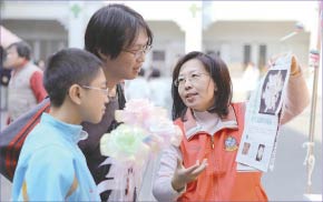 校慶當天老師在園遊會攤位前,熱心的向學生介紹水結晶實驗,鼓勵學生多發出「良善」的訊息。(攝影/吳柏樺)
