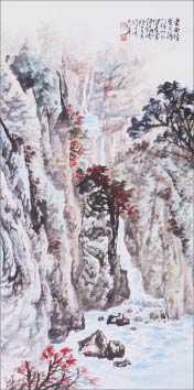 畫家描繪橫貫公路九曲洞燕子口的崖壁飛瀑,雄偉的太魯閣岩層中,添上飛瀉流澗與紅葉、碧潭,令觀賞者尤如身在莊嚴的殿堂上,見到璀璨的珠玉一般。