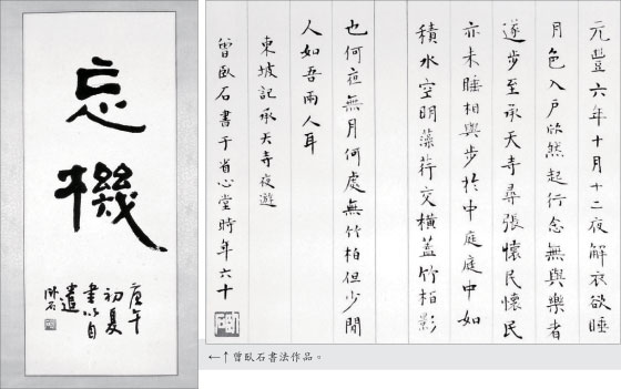 談起書藝,曾臥石強調書法要能創造出自己的東西,「不要寫來寫去,只會死板地臨摹。」但是,他繼續說道:「創作要有內涵。就以畫圖來說,一個天才,如果沒有基本功訓練,偶爾或許能畫出好東西,但是,很難得能有好東西。」