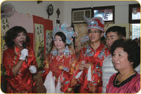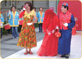 邱賢反串媒人婆和新郎、新娘逗趣。