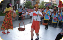 文南社區理事長陳清泉扮演大鼻子、穿吊帶短褲、小丑造型的「放炮舅」領著「搞笑版」的迎親隊伍進場。
