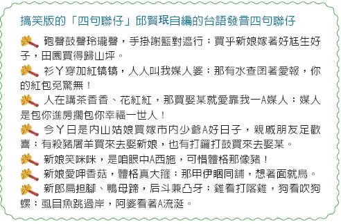 所謂的「四句聯仔」是以河洛話唸讀兩句以上,押相同韻腳或偶數句有相同韻腳的文辭。像諺語、童謠、歌仔戲、布袋戲、婚喪喜慶或祝壽等都有。在台灣和結婚有關的「四句聯仔」和俗語特別多,從作媒、提親、結婚到呷茶,都有含警惕、祝福或安慰意味的「四句聯仔」或俗諺。