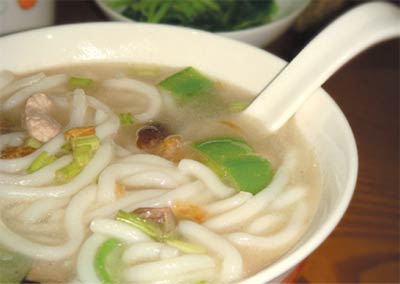 2、熱油鍋先放香菇炒香,再放肉絲、絲瓜略炒片刻後,加水煮到絲瓜變軟,放米苔目、芹菜末、油蔥酥即完成,吃米苔目有飽足感,所以米苔目湯是可當成飯來吃的湯品。◇