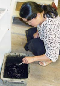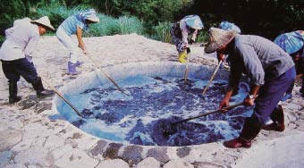 陽明山的藍染館模擬古法再現萃取藍泥技法。