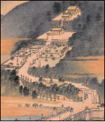 台灣神社全圖,下方可見明治橋與基隆河(1930年台灣博覽會政府宣傳資料)
