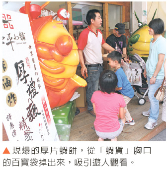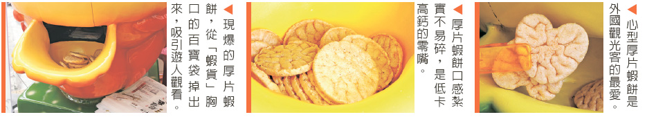 經2年的嘗試,蔡震宇研發出不用一滴油炸的鮮爆蝦餅。鮮爆蝦餅採用新鮮蝦子剪頭去尾,連殼打成蝦泥,搭配糯米、糙米、蛋白調和,經爆米餅機用220度高溫煎烤,7秒就能「ㄅㄥˋ」一聲瞬間膨發,過程充滿了聲音與香味,吸引遊人圍觀。不經油炸,放久了也不會有油耗味,讓蝦餅一躍成為高鈣低卡的健康零嘴。